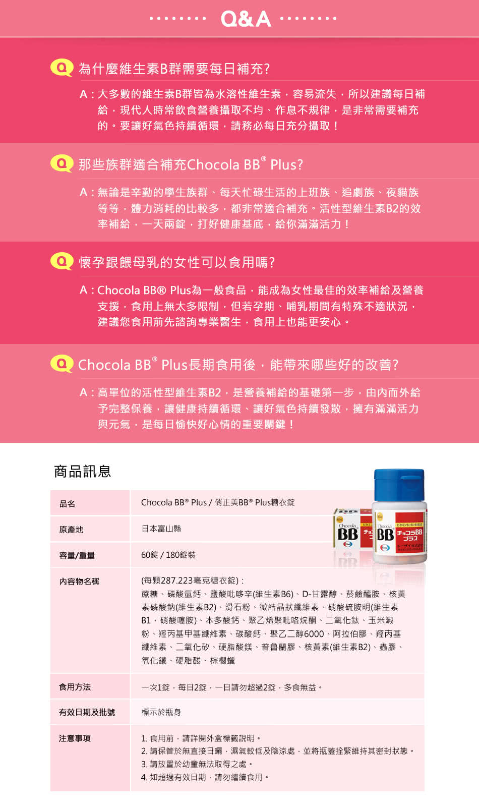 - 1.商品組合/規格:Chocola BB Plus 俏正美BB糖衣錠 60錠+180錠